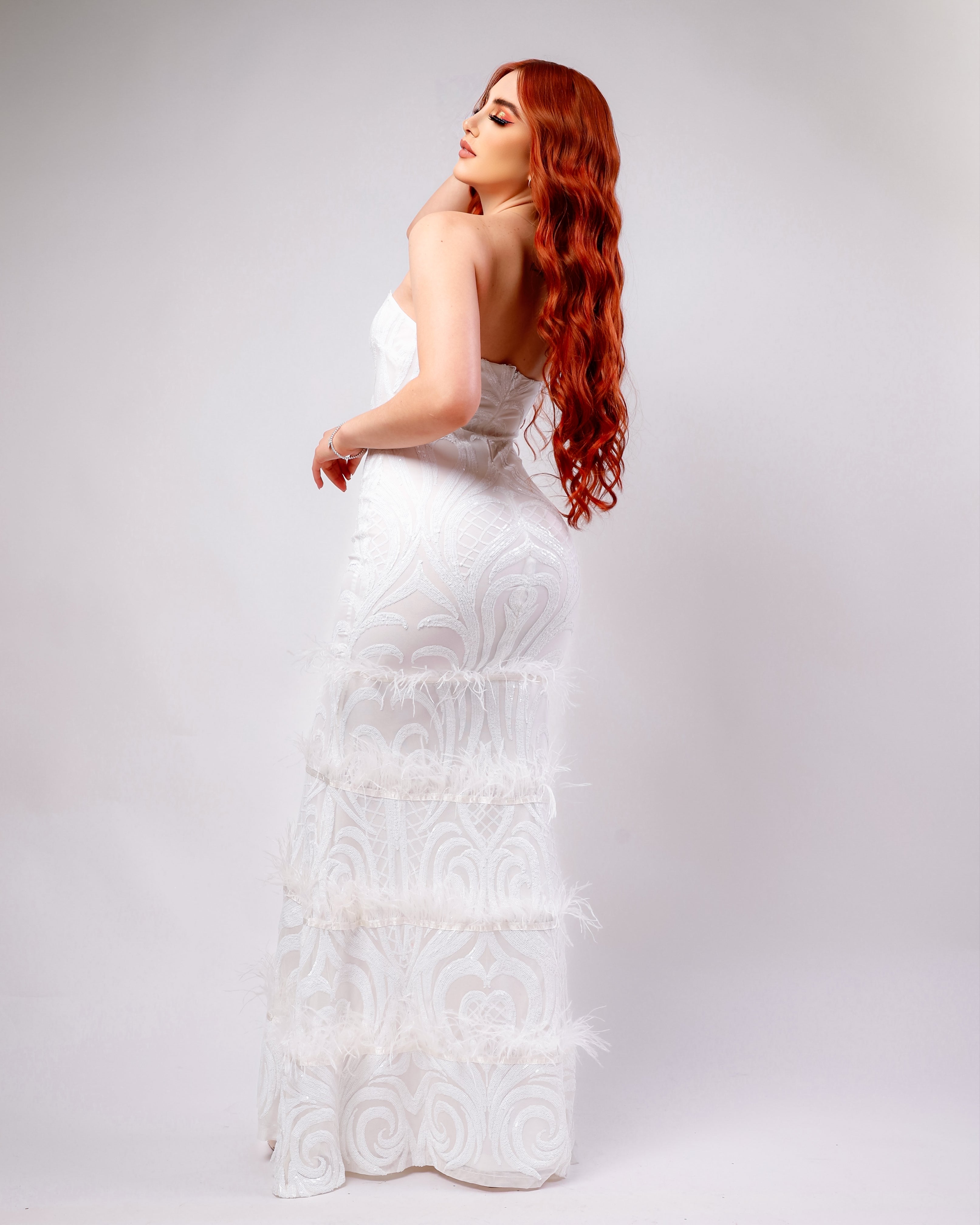 Vestido strapless con plumas